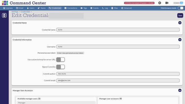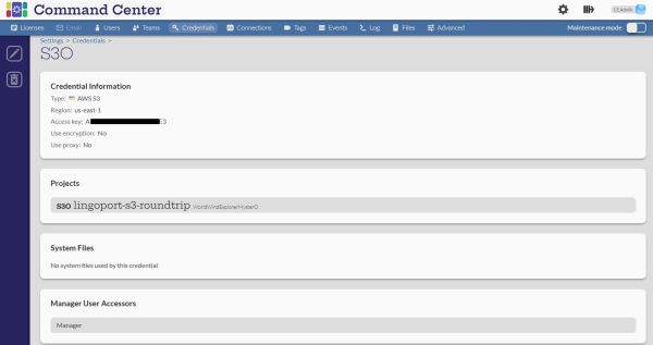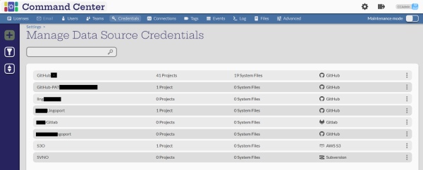 Alternatively, select the credential name, in Maintenance mode, and the Edit Credential button. Or, select the Edit button from the list of credentials. Select the Delete button. If the credential is being used by a project or a system file, it will not be able to be deleted.